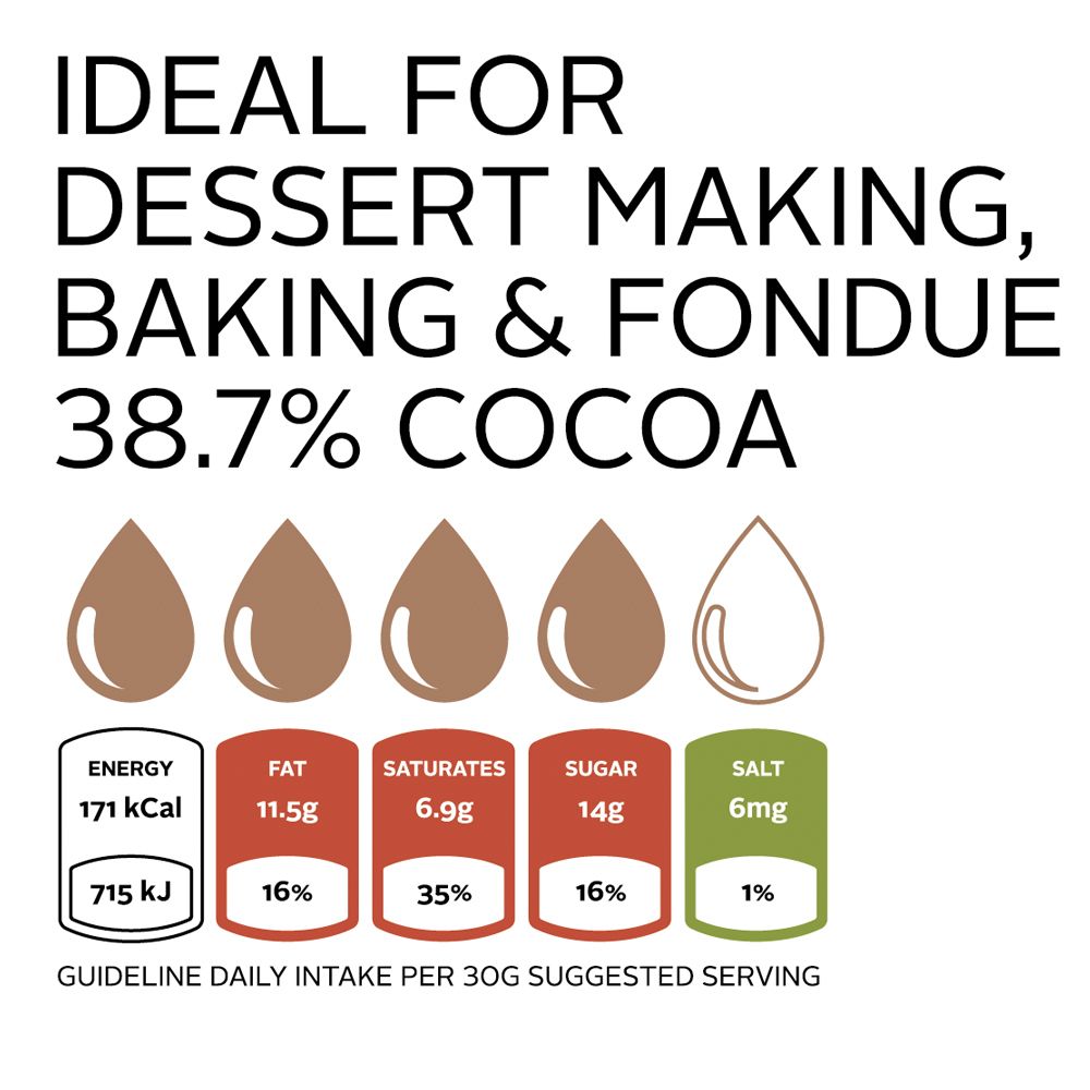 Specially formulated couverture chocolate developed for use in commercial chocolate fountains and home chocolate fountains, ready right out of the bag, no need for any additives - creates the perfect cascading effect in fountains and is as equally wonderful to use in making your favorite chocolate pastries or desserts.