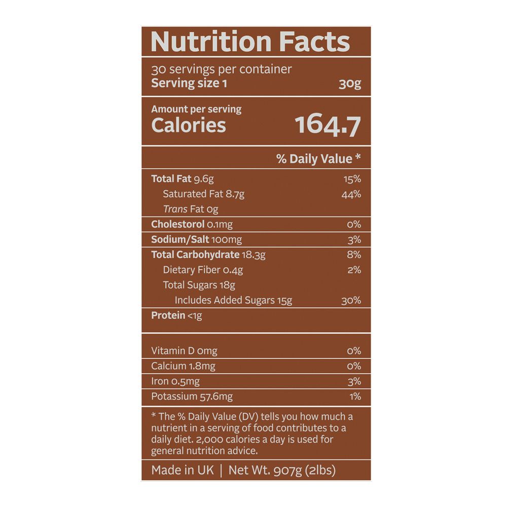 Ingredients (allergens in bold): Sugar, Palm Oil, Fat Reduced Cocoa Powder (14%), Emulsifiers: Lecithin (Soya), Polyglycerol polyricinoleate.