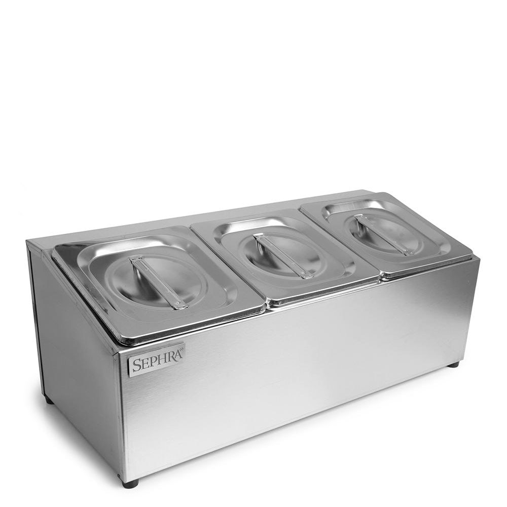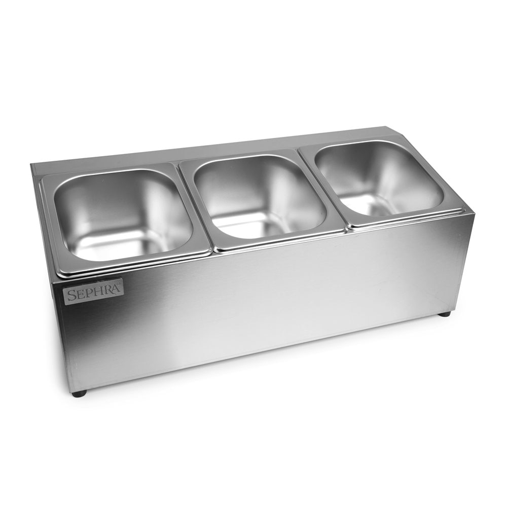 Whether you're serving toppings, condiments, sauces, or prepared ingredients, this 3-pan set offers a clean, organized, and hygienic way to manage your food service operation. It’s an ideal addition to any commercial kitchen, catering business, or foodservice display area.