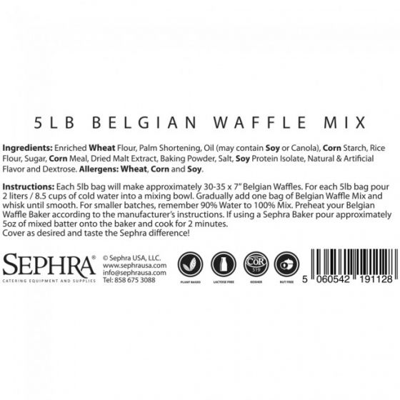 Yield: Each 5lb bag yields approximately 30-35 Belgian waffles in Sephra's 7" Belgian Waffle Baker.